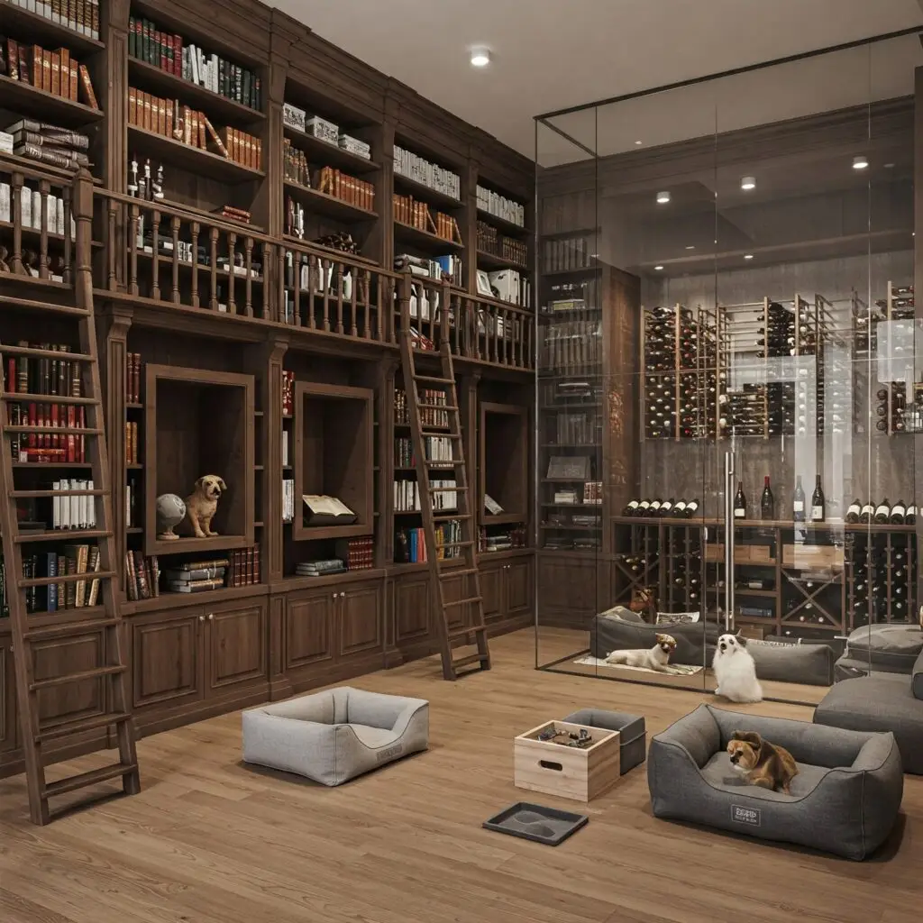 • Library Walls: Floor-to-ceiling shelving with rolling ladders and hidden reading nooks.