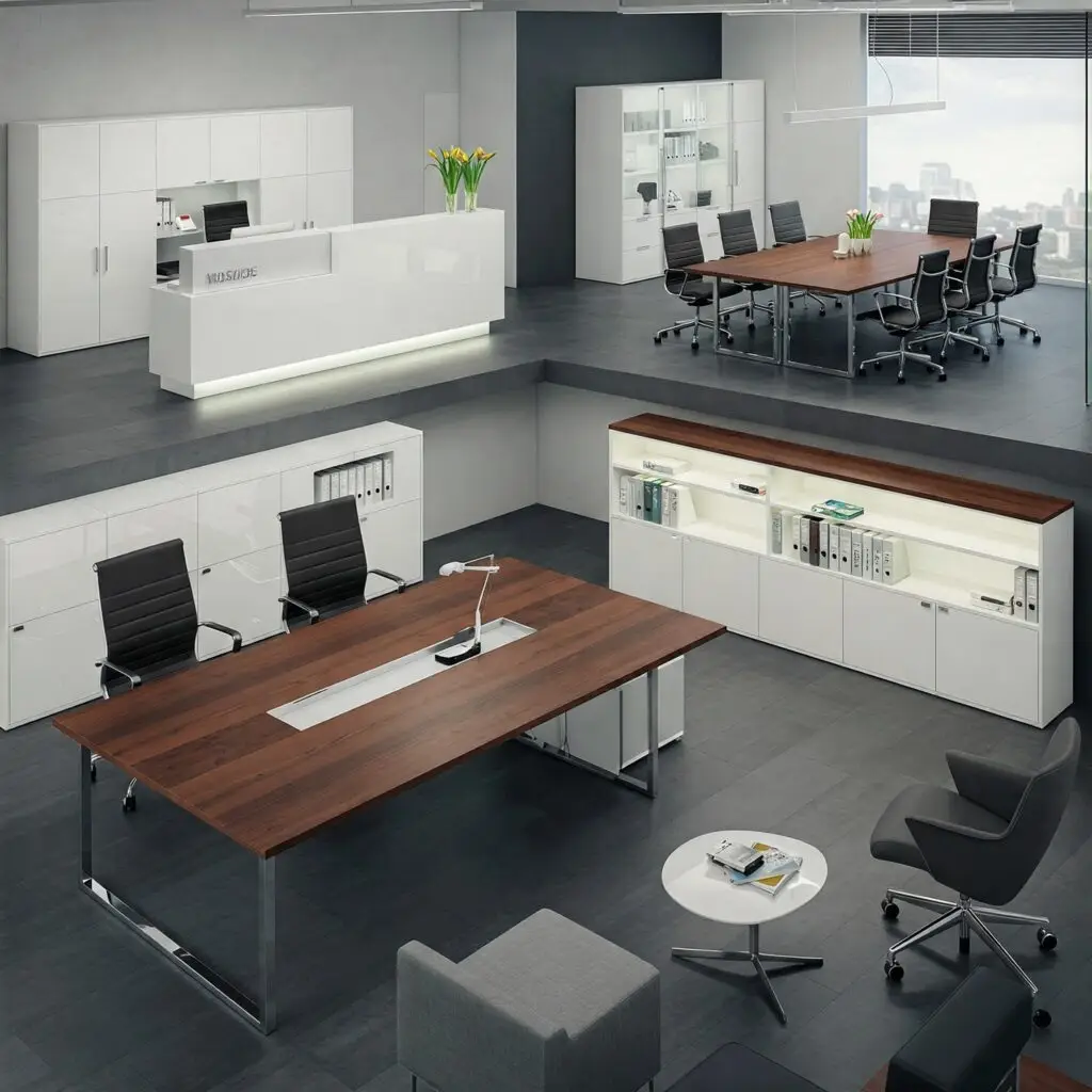 • Executive Office Tables: Ergonomic, custom-sized desks with built-in cable management, wireless charging pads, and modular add-ons.